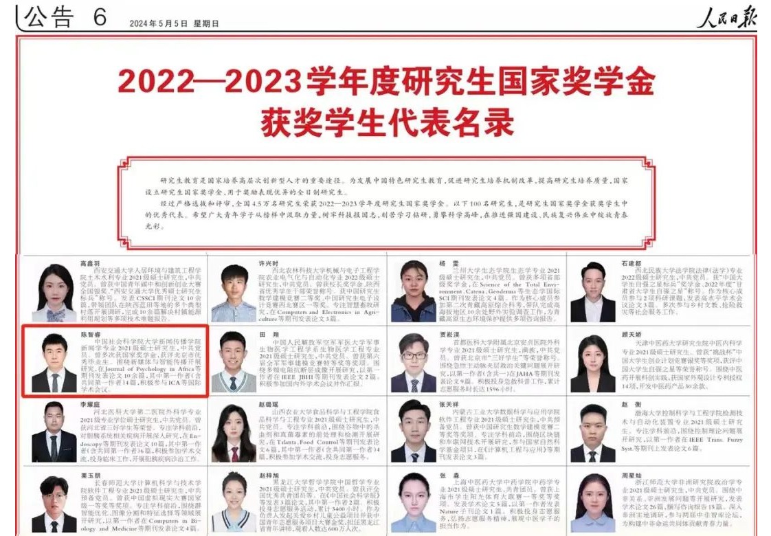 5月5日,《人民日报》刊登《2022-2023学年度研究生国家奖学金获奖学生代表名录》。经过严格选拔和评审,全国仅有100名学生入选研究生国家奖学金代表名...2024-06-11 -