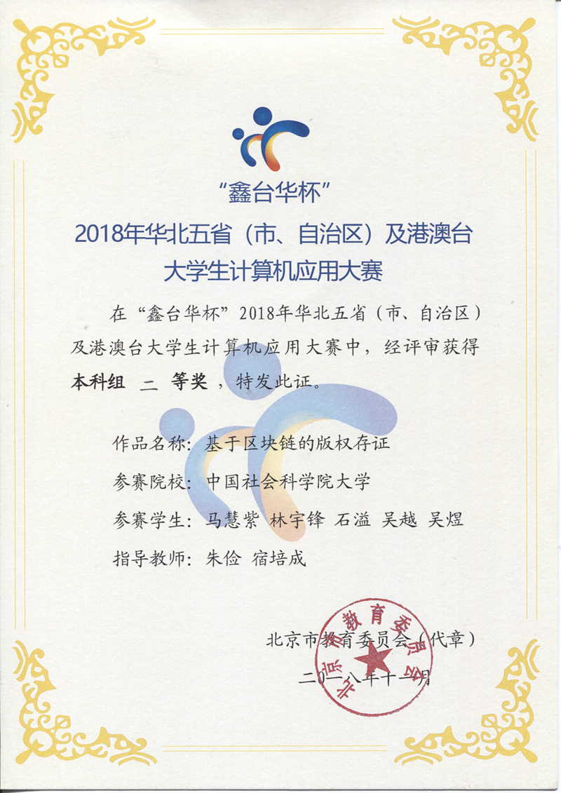 2018年11月10日,今年会计算机教研部组织学生参加了2018年华北五省(市、自治区)及港澳台大学生计算机应用大赛决赛答辩。此次竞赛在北京联合大学开展,吸引了华北五省、市、自治区以及台湾的近百所高校报名参赛,经过各赛区预赛选拔,来自5个分赛区的91支代表队进入总决赛答辩。在有众多理工类和综合类院校参赛的情况下,学生团队凭借作品 “基于区块链的版权存证”获得总决赛二等奖。