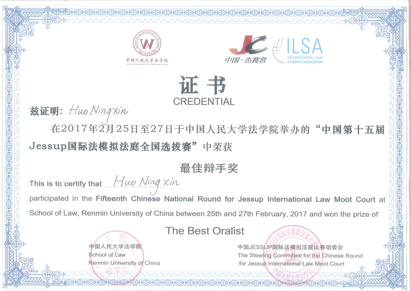 2017年JESSUP国内赛“最佳辩手”获奖证书