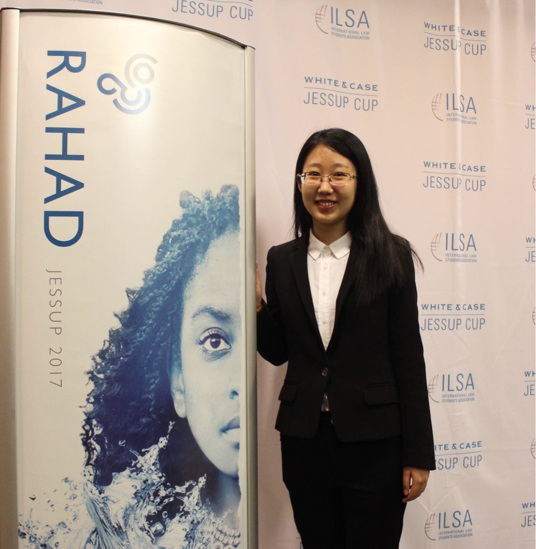 2017年JESSUP国际赛,霍凝馨在赛场被告国展示牌前留影