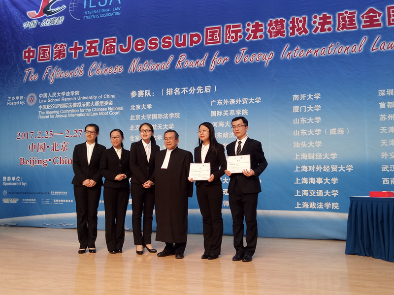 2017年JESSUP国内赛与村濑信也教授合影(右二为获得“最佳辩手”的霍凝馨)