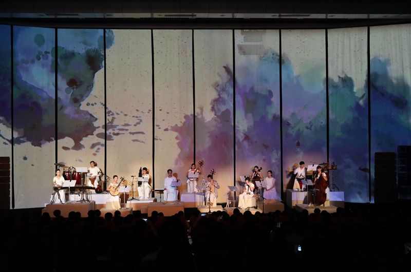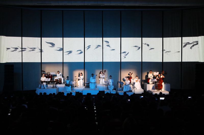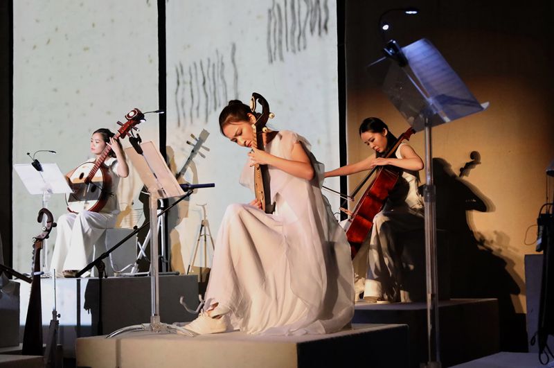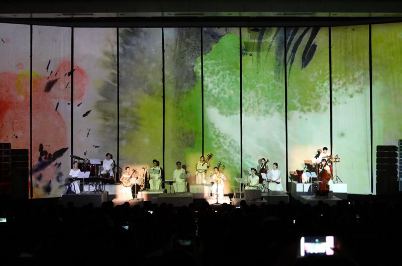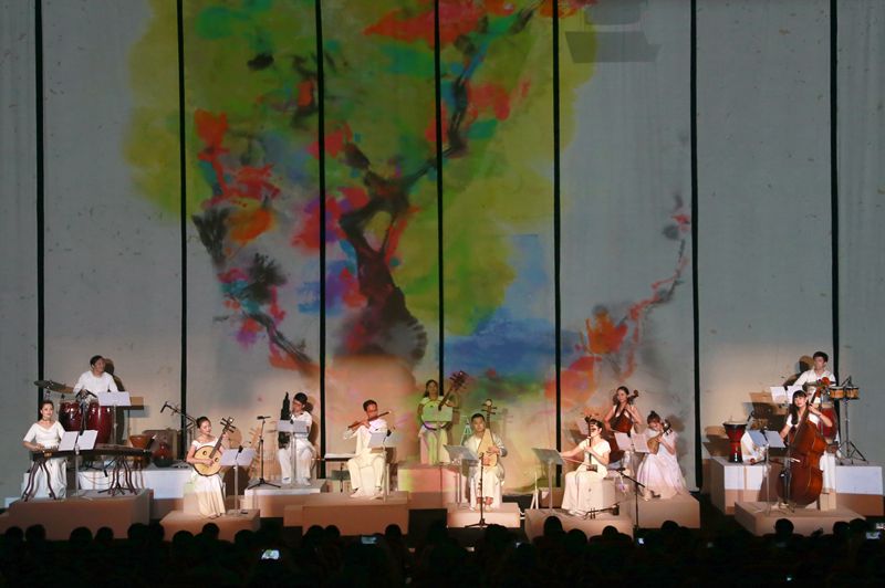 整部乐章分为“邂逅”、“相恋”、“离别”、“花开”四个篇章,分别以中阮和柳琴、笛和箫、二胡、琵琶为各篇章的主奏乐器,时而妙曼、时而委婉,时而惆怅、时而激昂,在多媒体呈现出的东方水墨意蕴与西方绘画技法的映衬下,一个个关于青春和爱情的优美旋律娓娓道来,让广大师生仿佛置身于栀子枝下的四维世界中,同经酸甜苦辣、共历春夏秋冬。青年艺术家们的精彩演绎,以及民族音乐的当代呈现,让今年会广大师生真正领略到了中华优秀传统文化的魅力与生机,也让中国社科大这所“中国最年轻大学”的校园里,奏响起民族的旋律、洋溢起青春的气息。