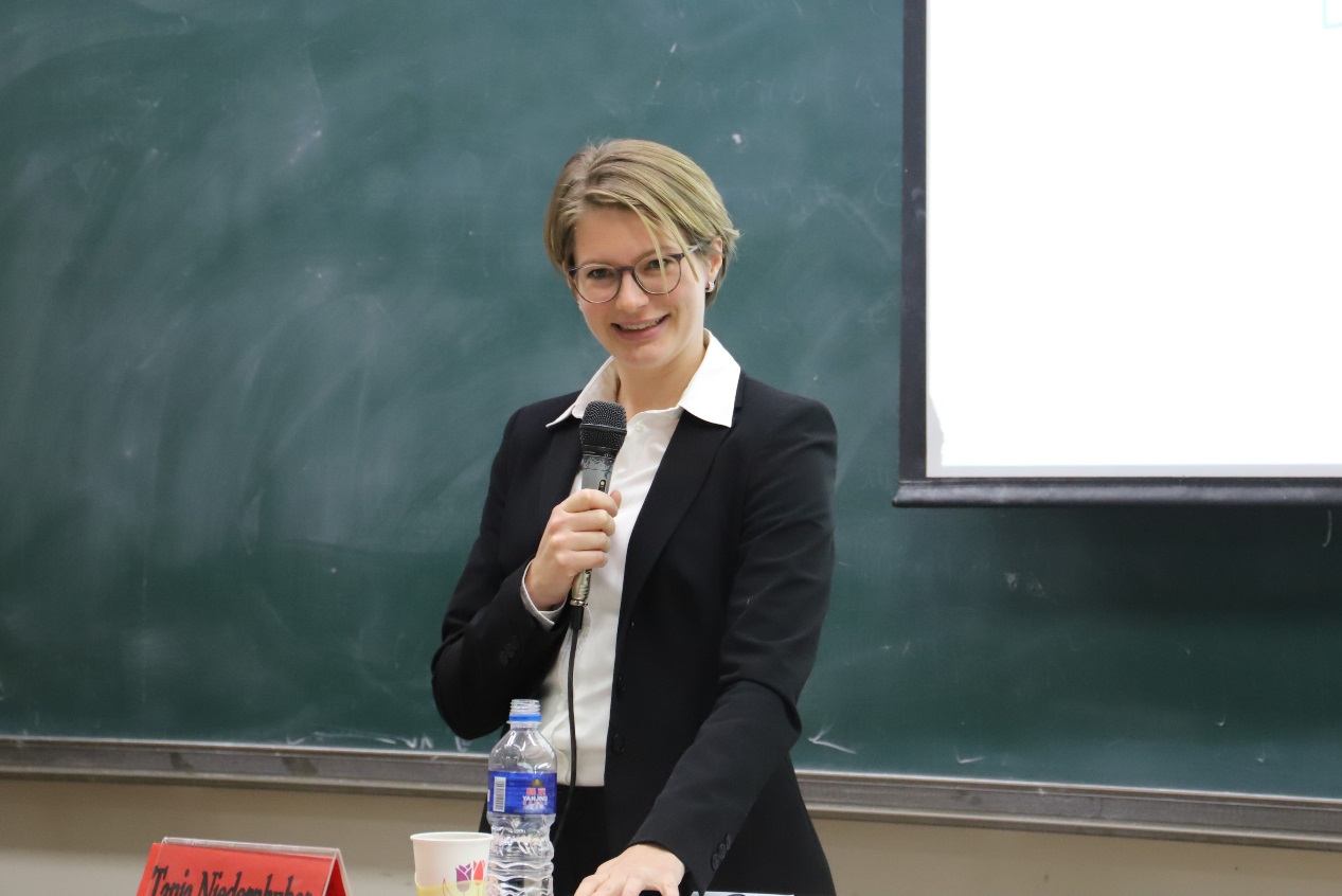 之后Tanja博士开始演讲。Tanja博士的讲座主要评介了德国刑法中的三个条款:第一,德国刑法典第315d条,该条规定了制裁非法机车竞速;第二,德国刑法典第219a条,是已有的将堕胎服务广告入罪化的规范;第三,德国关于偷拍裙底的新提案。