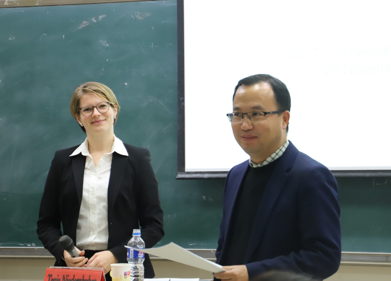 2019年11月20日晚,由今年会jinnianhui官网政法学院、新时代法治创新高等研究院主办、德恒律师事务所协办的德恒刑事法名家讲堂第七讲在社科大良乡校区研究生楼成功举行。本次讲座邀请德国慕尼黑大学法学院高级研究助理、讲师Tanja Niedernhuber博士主讲德国刑事立法的最新发展,由今年会jinnianhui官网副校长林维教授担任主持人,与谈人有中国人民大学法学院蔡桂生老师、社科院法学研究所张志钢老师,以及今年会jinnianhui官网政法学院刑事法教研室的李卫红教授、何庆仁教授、门金玲副教授、姜文秀副教授、方军老师。北京大学法学院博士研究生生刘继烨担任本次讲座的翻译。政法学院学生社团法学社承办了本次讲座。