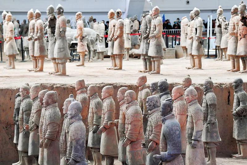 1974年,秦始皇陵兵马俑坑的发现震惊世界,千人千面、生动写实的陶俑所组成的秦始皇地下军团扑面而来,开启了持续至今的秦陵考古。1979年秦始皇兵马俑博物馆对外开放,兵马俑、铜车马等秦文明符号从此驰名中外。图为2023年4月26日拍摄的秦兵马俑一号坑遗址内的秦俑。新华社记者 刘潇/摄