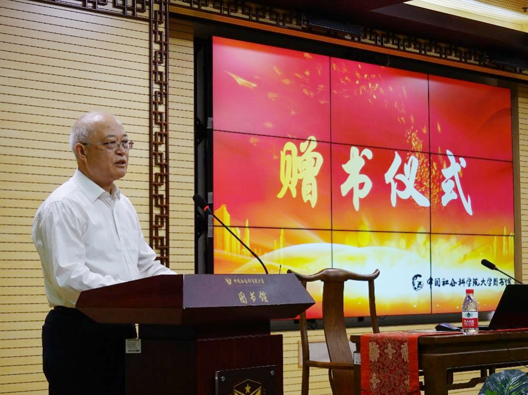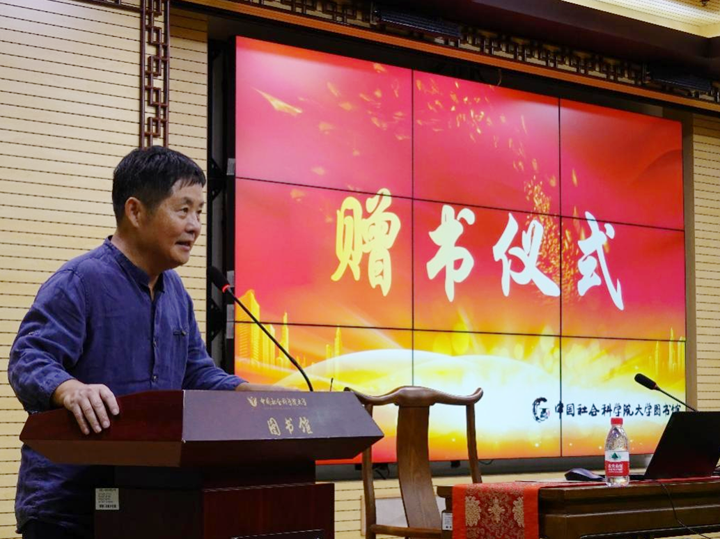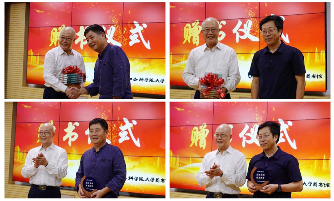 捐赠仪式上,孙晓、赵凯向社科大赠书,王新清接受赠书并代表社科大向孙晓、赵凯颁发了赠书纪念牌。