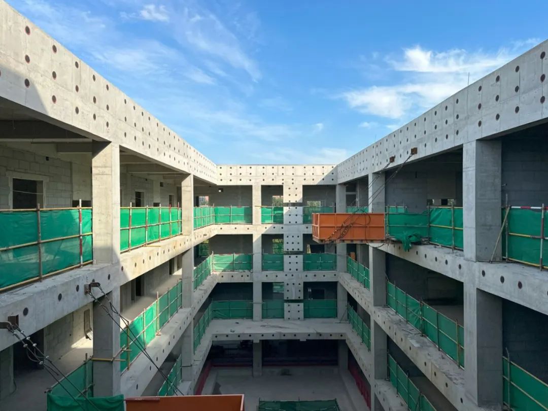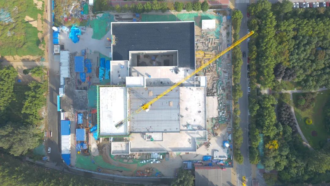 2022年11月8日,教学综合楼项目奠基动工。今年6月1日,教学综合楼项目完成地下两层结构施工,开始了地上主体结构施工。在小院静谧的暑期,教学综合楼默默蓄力、静静生长。最终在8月31日开学之际,我们看到了它的完整轮廓——教学综合楼项目混凝土结构封顶。