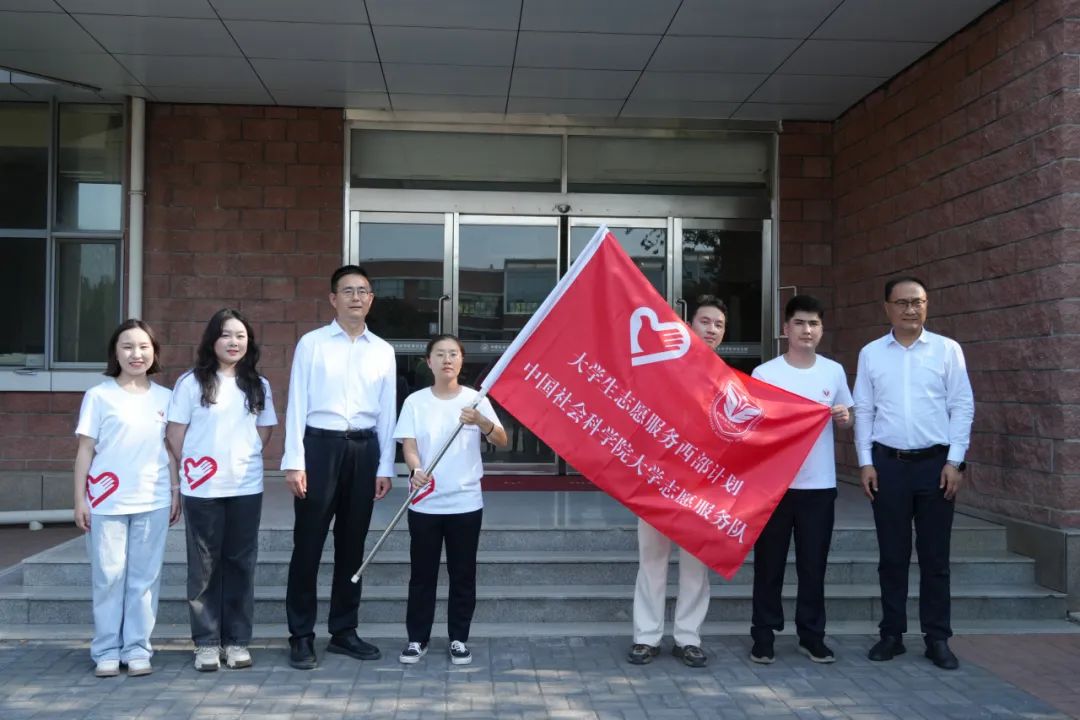 崔唯航为2024年西部计划志愿者和第26届研支团全体成员授旗。张树辉向志愿者们赠送纪念礼物并和大家亲切交流。