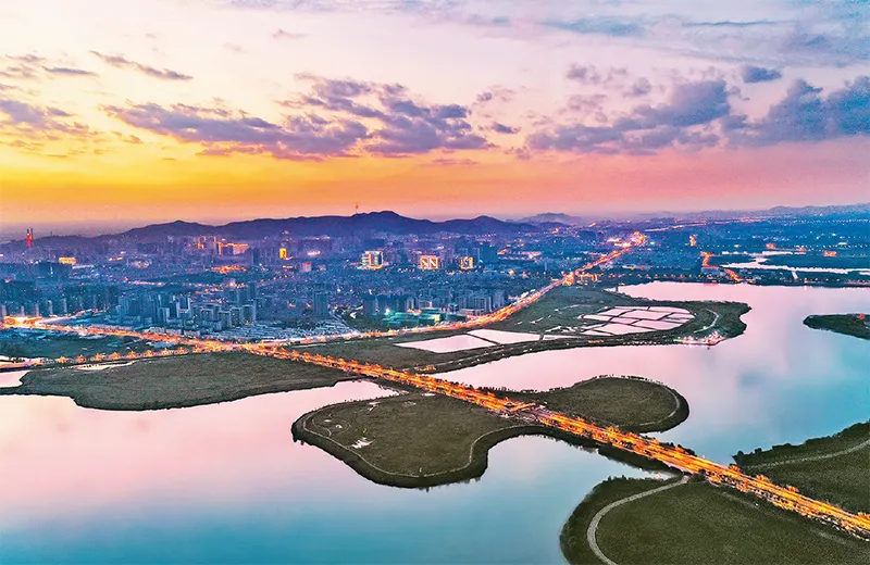 中国式现代化是人与自然和谐共生的现代化。近年来,安徽淮北市有力提升采煤塌陷区改造工作,以生态修复为基础,实施南湖、乾隆湖、绿金湖、碳谷湖、古乐湖、朔西湖等六大塌陷湖泊治理工程,城市中心正逐步形成100多平方公里的中心湖带和国家城市湿地公园,淮北人民“拥湖发展”的梦想从蓝图变成现实。图为昔日荒草废滩的采煤沉陷地,变成了美丽的生态公园。 人民图片 牛旭东/摄