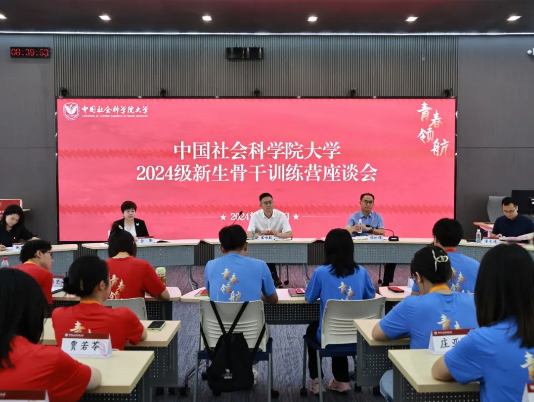 座谈会上,2023级新生骨干训练营学员代表孙丽果、詹洵梓分享了心得体会。他们回顾了参加骨干营以来一年时光里的学习和成长经历,并鼓励新学员珍惜学习机会,不断超越自我,向着光、追逐光、成为光,成就更好的自己。2024级新生骨干训练营学员代表童培霖、韩泽宇、尹涛、刘唯宽、牟思源就自己对学校的初印象、来到社科大的缘由以及对未来的期冀等进行分享。新的环境、新的挑战,同学们对未来的校园生活充满期待。