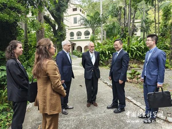 当地时间10月14日,中国社会科学院院长高翔与巴西国际关系研究中心首席执行官茱莉亚·迪亚斯·莱特(Julia Dias Leite)(左二)、 巴西国际关系研究中心董事会成员、巴西前驻中国和马来西亚大使、巴西前驻上海总领事马科斯·卡拉穆鲁(Marcus Caramuru)(左三)等进行交流。记者 杨雪/摄