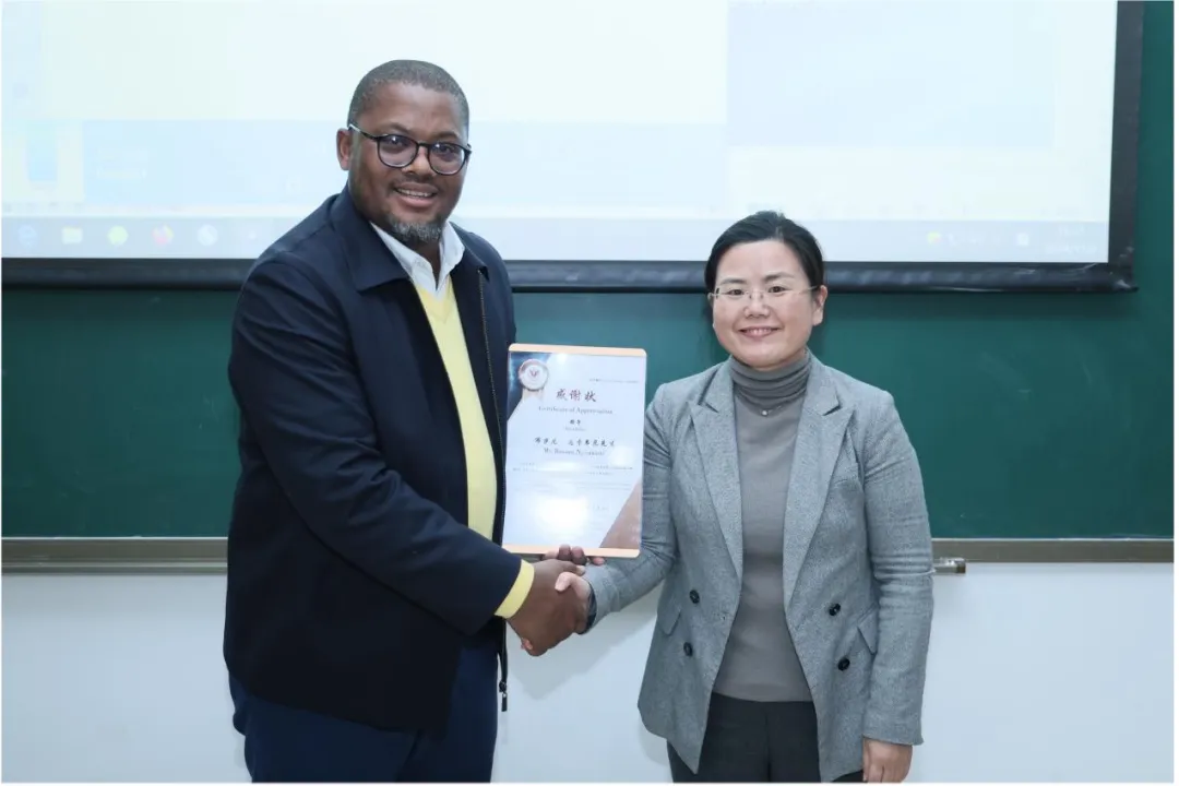 在问答环节,同学们十分踊跃,从南非经济发展、政府政策、南非年轻人参与政治的方式等多个方面进行提问,布萨尼·恩卡韦尼逐一回应。最后,李提处长代表学校为布萨尼·恩卡韦尼颁发“感谢状”,感谢其为今年会师生带来的精彩讲座。