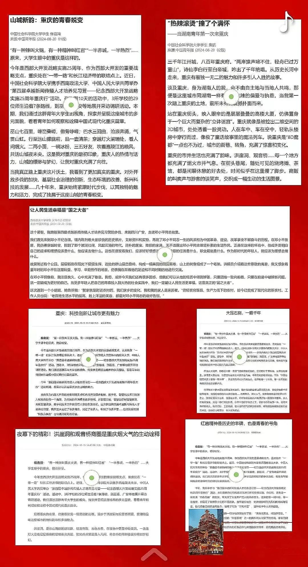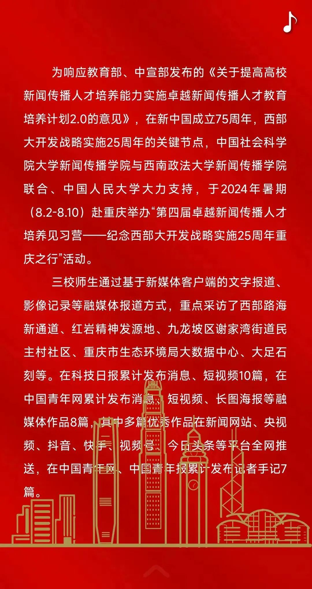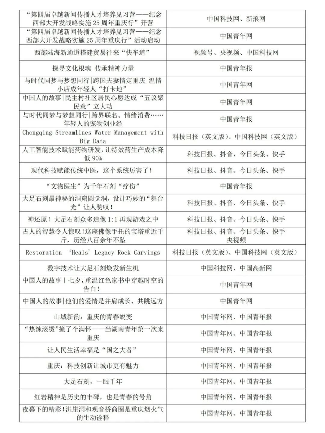 三校师生重点采访了西部陆海新通道、红岩精神发源地、九龙坡区谢家湾街道民主村社区、重庆市生态环境局大数据中心、大足石刻等地,并通过新媒体客户端进行文字报道、影像记录等融媒体报道。在科技日报累计发布消息、短视频10篇,在中国青年网累计发布消息、短视频、长图海报等融媒体作品8篇,其中多篇优秀作品在新闻网站、央视频、抖音、快手、视频号、今日头条等平台全网推送,在中国青年网、中国青年报累计发布记者手记7篇。