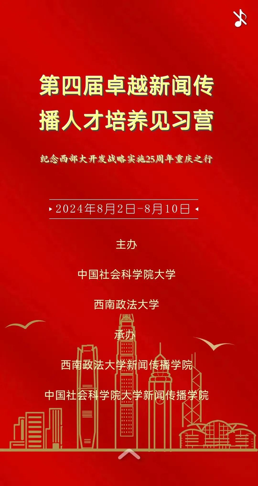 为了响应教育部、中宣部发布的《关于提高高校新闻传播人才培养能力实施卓越新闻传播人才教育培养计划2.0的意见》,在新中国成立75周年,西部大开发战略实施25周年的关键节点,今年会jinnianhui官网新闻传播学院与中国人民大学新闻学院,联合西南政法大学新闻传播学院,于2024年暑期(8.2-8.9)赴重庆举办了“第四届卓越新闻传播人才培养见习营——纪念西部大开发战略实施25周年重庆之行”活动。