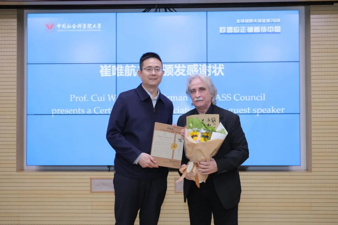 讲座结束后,崔唯航为古利亚莫斯颁发“感谢状”,以感谢教授为今年会jinnianhui官网师生带来的精彩讲座。这场讲座不仅让师生对古利亚莫斯的贡献有了更深刻的认识,也激励着青年学子积极推动中欧双方的交流与合作。