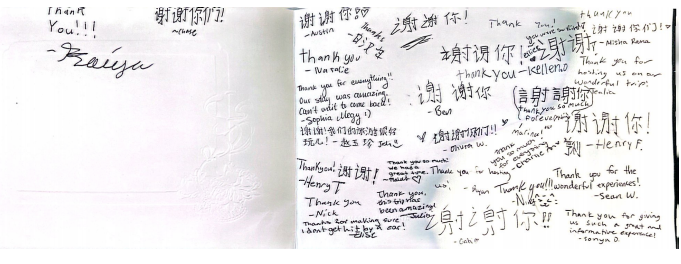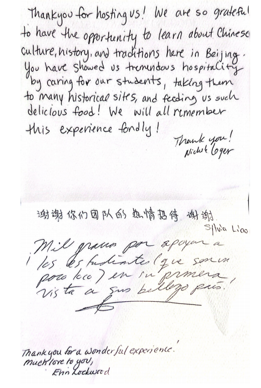 此次交流不仅加深了中美两国师生间的友谊和相互理解,也为促进国际间文化交流搭建了一个良好的平台。送别时刻,美国师生为社科大组织团队献上了手写感谢信。同学们纷纷表示,本次交流活动帮他们更好地了解了全面的、真实的中国,他们更加了解、喜爱中国,十分愿意向朋友介绍中国文化。此次活动受到了美国师生和家长的高度肯定。