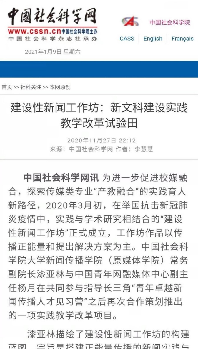中国社会科学网以《建设性新闻工作坊:新文科建设实践教学改革试验田》为题进行报道