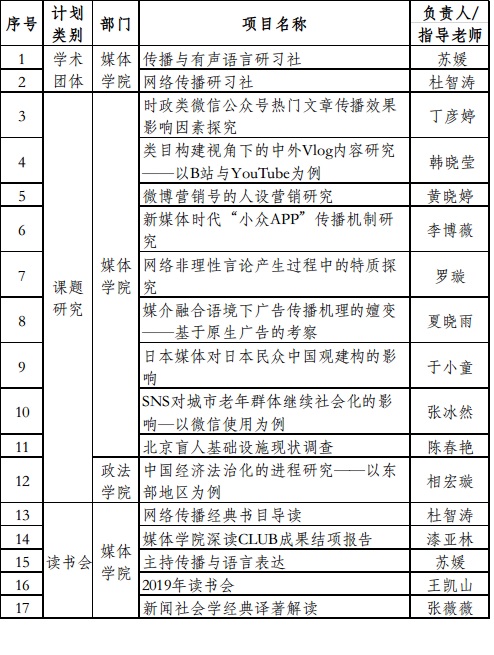 2020年3月27日,校新苗计划评审委员会对2018-2019年度新苗计划第三批申请结项的2个学术团体、5个读书会和10个课题研究项目进行结项评审。本次申请结项的项目均经各学院评审小组初评、科研处项目评审小组复审后提请校新苗计划评审委员会审议。受疫情影响,此次结项评审基于学校投票平台匿名进行。