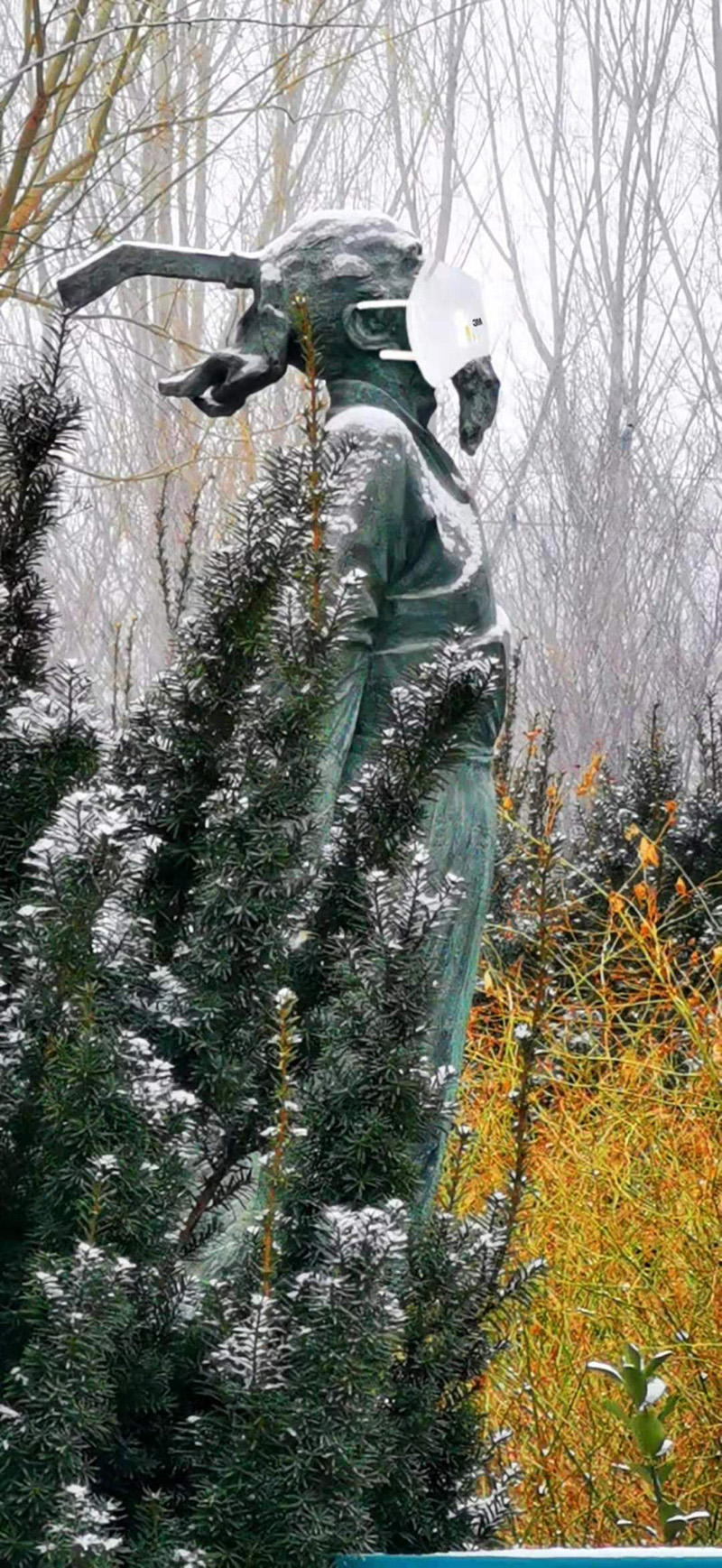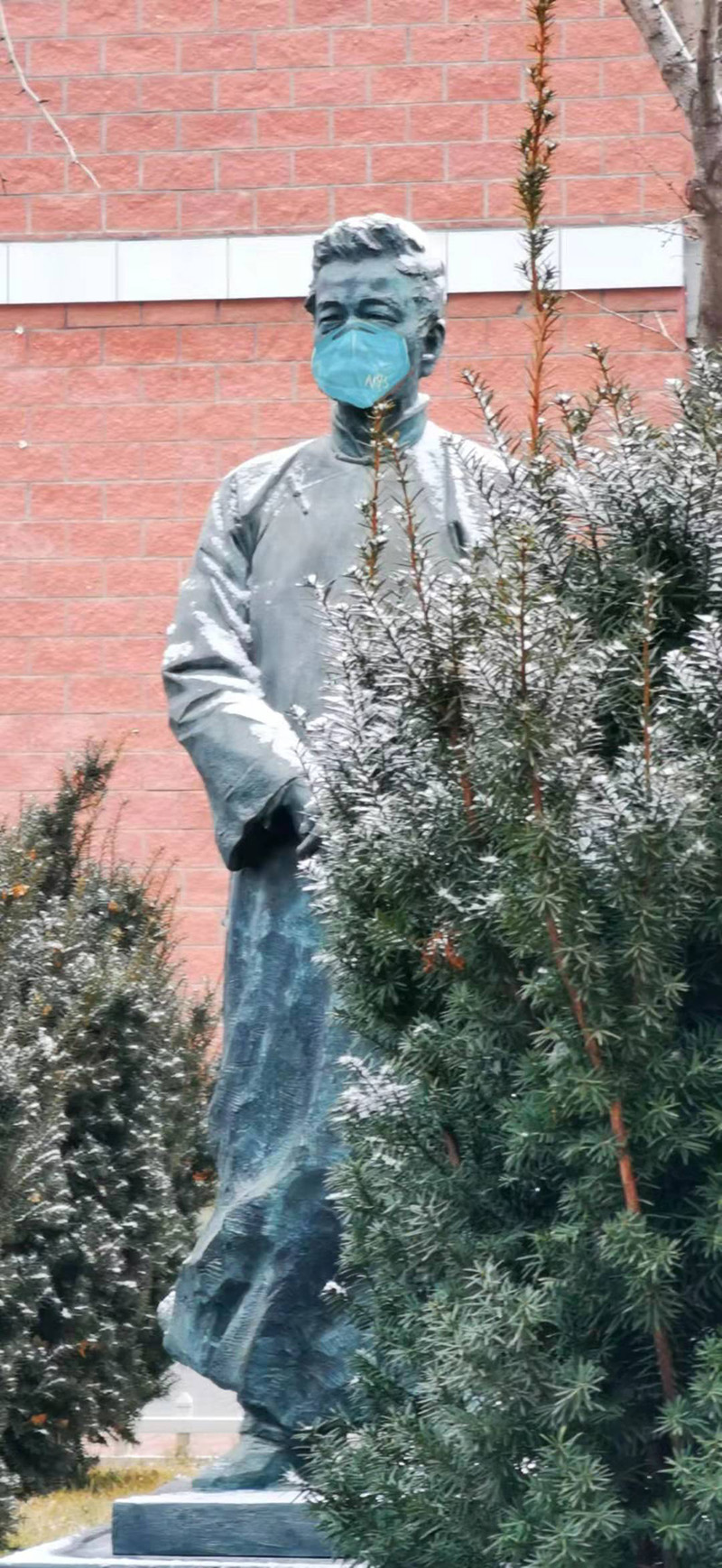 校园里的雕塑也被可爱的师生ps上了口罩,同学们笑称,鲁迅先生是在“横眉冷对不戴口罩者”,屈原感慨,“路漫漫其修远,上下同心胜疫情!”(科技日报记者 王小龙,图片由社科大防指办提供)