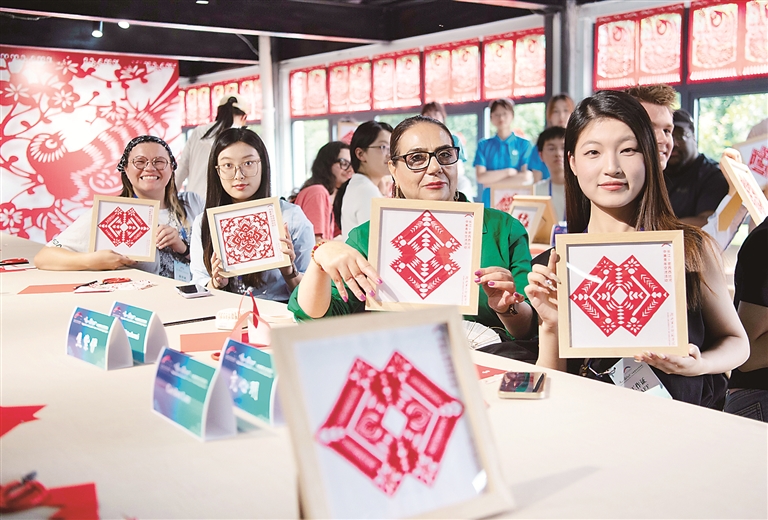 近日,“长江-密西西比河”中美青年交流活动在湖北举行,40余名中美青年走进湖北省十堰市、武汉市和宜昌市,感受荆楚文化。图为在湖北第二师范学院,交流活动成员展示剪纸成果。新华社记者 杜子璇 摄