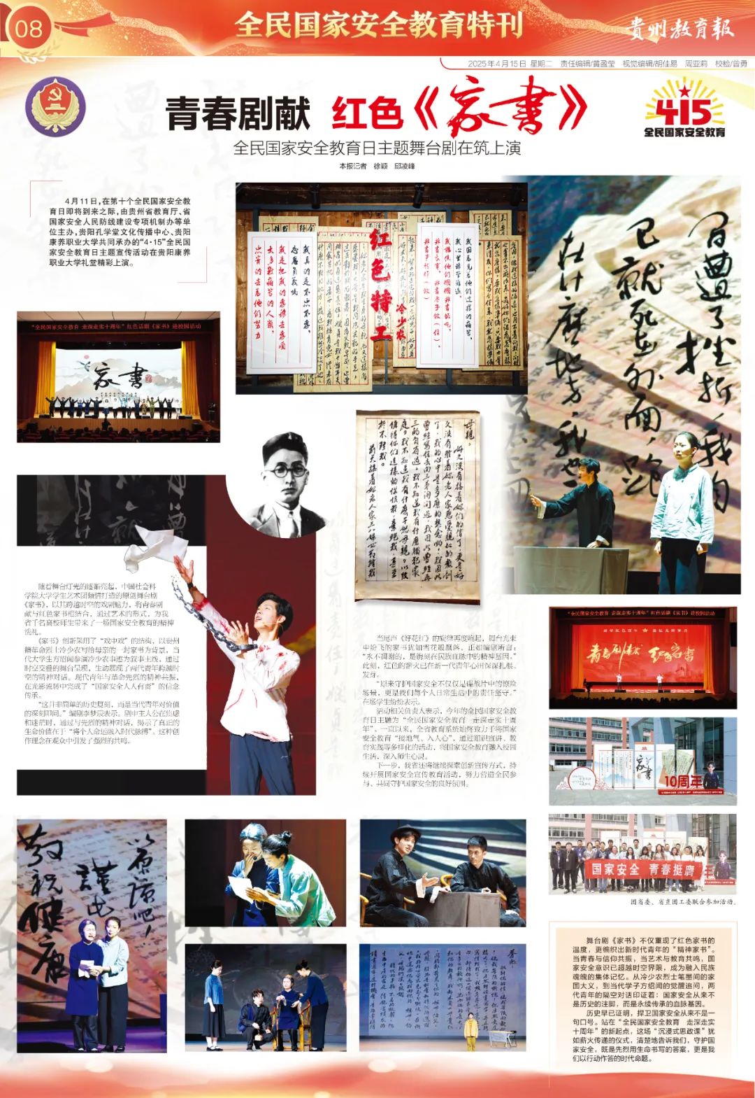 4月11日,在第十个全民国家安全教育日即将到来之际,由贵州省教育厅、省国家安全人民防线建设专项机制办等单位主办,贵阳孔学堂文化传播中心、贵阳康养职业大学共同承办的“4·15”全民国家安全教育日主题宣传活动在贵阳康养职业大学礼堂精彩上演。 随着舞台灯光的逐渐亮起,今年会jinnianhui官网学生艺术团倾情打造的原创舞台剧《家书》,以其跨越时空的戏剧魅力,将青春剧献与红色家书相结合,通过艺术的形式,为我省千名高校师生带来了一场国家安全教育的精神洗礼。